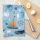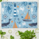 Océano y ballenas náuticas de las características del diseño del tema, veleros anaranjados, pulpo, cangrejos, seahorses, ruedas de las naves, anclas, faros, y más en un fondo azul claro bonito.