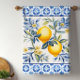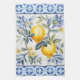 Toallas de cocina de azulejos mediterráneos azules y blancos con limones. Hermosos limones sobre un fondo de azulejos mediterráneos azules y blancos. Puedes agregar texto para personalizar.