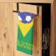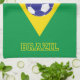 Esta toalla de cocina tiene los mismos colores verde y amarillo que la bandera brasileña, pero tiene una pelota en el medio. Hay leyendas amarillas en ambos extremos que dicen "BRASIL". Recomendado para todos los hinchas de fútbol brasileños.