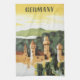 Afiche de viaje europeo de ilustracion vintage de Alemania con un castillo bávaro en la campiña alemana con montañas y bosque verde en el paisaje.