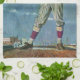 Ilustración deportiva antigua de béisbol que presenta a un jugador de béisbol con uniforme a rayas. El lanzador está a punto de lanzar una pelota para comenzar la próxima entrada.