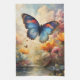Una gran vela de mariposa azul y roja rodeada de flores bordea un arroyo en un día nublado sobre esta impresionante toalla de cocina. Perfecto para quien ame las mariposas, flores, naturaleza y el exterior.