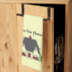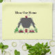 Esta bonita y elegante casa con techo gris oscuro y puerta delantera roja. Árboles y un camino a pie. Dice 'Bendiga nuestro hogar'