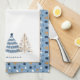 toalla de cocina para navidades con modernos y sencillos árboles navideños azules y bordes con motivos de puntos azules. Personalizar fácilmente el texto - Kate Eden Art