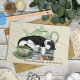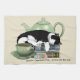 Un lindo gato de esmoquin blanco y negro durmiendo en un montón de libros con una tetera verde detrás y una taza de té delante