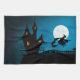 una bruja volando en su escoba pasando la luna llena con una casa oscura en el fondo y un gato en la cerca