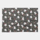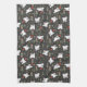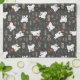 Conejos blancos ilustrados, tulipanes, flores rojas y hojas sobre un fondo gris para primavera y Pascua.