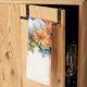 Toalla de cocina con una imagen de otoño. Calabazas naranjas y blancas rodeadas de hojas caídas y flores naranjas.