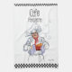 Caricatura, gorda cocinera francesa con el uniforme del chef y gorra blanco, que sirve un entrante caliente con toallas de cocina azules y blancas. Text Cafe Parisienne en la parte superior con cheques en blanco y negro en la parte superior e inferior de la toalla. Obra de arte de Patricia Villa.