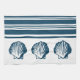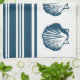 Diseño náutico con conchas azules y decoración de rayas sobre fondo blanco