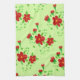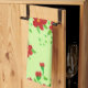 Cocina o toalla de baño con fondo verde apio claro y motivos de arte floral rojo. Diseño de cocina o baño fresco y fresco.