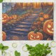 Esta toalla de cocina cuenta con una mansión espeluznante en el bosque con ventanas iluminadas rodeadas de muchas calabazas. ¡Perfecto regalo de Halloween! Texto personalizado.