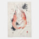 Una elegante obra de arte de acuarela con dos vibrantes gambas naranjas en una elegante composición. La imagen incorpora caligrafía japonesa tradicional y salpicaduras de tinta artística, evocando un sentido de armonía y finura cultural. El fondo minimalista realza los trazos detallados y la esencia animada de las gambas.