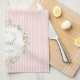 This kitchen towel has a wreath of pink flowers in a wreath with a pink striped background with text that says "Christ the Lord is Risen."