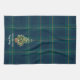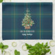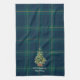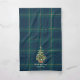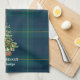 Personalized Christmas kitchen hand towel featuring festive Christmas tree with classic forest green and navy tartan plaid design.