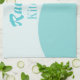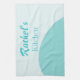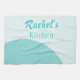Perfecto para derrames, esta toalla de cocina de remolinos azules puede ser personalizada para su deleite. Esta toalla de cocina tiene un fondo de semicírculo azul que tiene un color de agua en la esquina inferior izquierda, con el resto del diseño en azul claro. Tu nombre está escrito en la parte superior en azul cursivo con "Cocina" escrita en manuscrito azul. ¡personalizar tuyo hoy! Material gráfico original: © 2016, Rhonda Jones