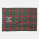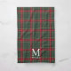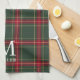 Personalized kitchen towel for the holiday season featuring classic style forest green and red Christmas plaid pattern with custom initial and name.