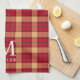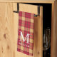 Personalized kitchen towel for the holiday season featuring classic style Christmas plaid with custom initial and family name.
