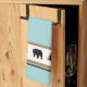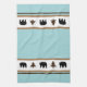 Esta toalla de cocina se muestra en una tira de osos y abetos adorables en forma de lodge con siluetas de color negro y marrón chocolate sobre rayas blancas y marrones y toallas de acento a color agua y chocolate. Personalizar este artículo o compra tal cual.