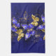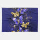 Composición de lujosas mariposas de zafiro y joyas de oro sobre fondo de textura azul.