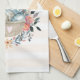 Una toalla de cocina con un patrón de melocotón y rayas blancas. Un ilustracion digital hecho con acuarelas. Un lindo conejo con un vestido azul sentado en una canasta rodeada de sus huevos. Las mariposas revolotean alrededor de la cesta decorada con un florido ramo.