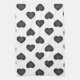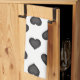 Esta toalla de cocina presenta un patrón repetido de corazones negros de dos tonos sobre un fondo blanco.