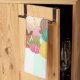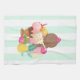 Una toalla de cocina ilustrada con un cuenco de helado con tres deliciosas copas cubiertas de rociadas de caramelo. También hay un cono de helado con 3 cucharas de chocolate, vainilla y fresa. Un bol de postres lleno de helado de sabor neopolitano con una deliciosa cereza encima. Patrón de rayas verdes y blancas en el fondo.