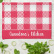 Agrega un toque de encanto a tu cocina con esta toalla de té personalizable que presenta un patrón de cuadros rojos vintage sobre un fondo blanco crujiente, acentuado con bordes rojos vibrantes, y texto personalizable que dice "Cocina de la abuela". Esta toalla de cocina elegante y práctica será un regalo ideal para cualquiera que ame cocinar o hornear. Modifica el nombre para crear un regalo único e irrepetible para cocineros. Perfecto para cumpleaños, Día de los Abuelos, fiestas de inauguración de casa o cualquier ocasión especial.