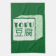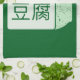 Ilustracion de un cubo de tofu dibujado en un color verde claro. El texto japonés del tofu dice tofu.