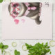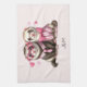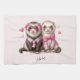 Toalla de cocina con un bonito ilustracion. Un par de nutrias con ropa rosada. Vestidos de camisetas a rayas, uno con corbata y el otro con un arco. Rodeado de corazones de amor.