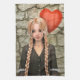 Representación digital en 3D de un bello chica adolescente con un vestido retro sosteniendo un globo en forma de corazón sobre un fondo de pared de piedra. Un regalo perfecto para el El día de San Valentín