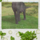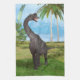 Representación digital 3D de un dinosaurio Brachiosauro sobre el fondo del cielo azul y palmeras verdes