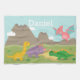 Una toalla de cocina linda y colorida del dinosaurio. Viene con dinosaurios del dibujo animado, un Brachiosaurus amarillo, un Triceratops púrpura, un Stegosaurus verde y un Pterodactylus rosado. Fondo de montañas y de nubes. Este diseño atractivo es grande para los niños que aman temas jurásicos, prehistóricos o del dinosaurio. Añada el nombre del niño para hacerlo extraordinariamente especial.