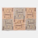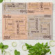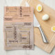 Un diseño único de toallas de cocina que combina bloques de color beige y melocotón con bloques de texto boca arriba y abajo de las palabras chocolate, chocolate negro, almendras en inglés, alemán y francés, más otras palabras en una variedad de estilos de fuente, tamaños y colores.