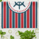 Diseño náutico con decoración de ruedas de vela en forma redondeada con estrellas sobre fondo rayado rojo, azul y blanco