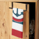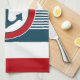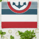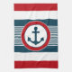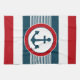 Diseño náutico con decoración de ancla en forma redonda sobre fondo rayado azul, rojo y blanco