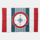 Diseño náutico con decoración de brújula en forma redonda sobre fondo rayado azul, rojo y blanco