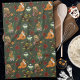 Un zorro rojo, conejo, búho, luna moth, pino marten con hojas de otoño, calabazas, flores y bellotas en un fondo de verde profundo.