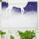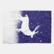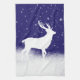 Una silueta blanca de un ciervo caminando por la nieve mientras los copos de nieve caen sobre un fondo azul crema una hermosa toalla de cocina para las vacaciones.