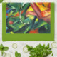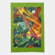 Colorida pintura del artista alemán Franz Marc de un mono en la jungla sentado en un árbol caído, mirando hacia atrás sobre su hombro. Aceite sobre lienzo con colores primarios brillantes y simplicidad cruda. "El mono" 1912.