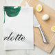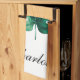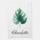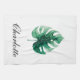 Diseño de toallas de cocina a la moda con una hoja de monastera verde color agua pintada a mano. El texto es personalizable.