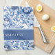 Elegant Blue and White Chinoiserie Floral Pattern kitchen towel features an elegant all-over botanical pattern inspired by classic chinoiserie artwork, blending detailed blossoms and foliage in soft blue and white tones. The intricate floral illustration creates a timeless, vintage-inspired aesthetic while maintaining a clean and refined look. A coordinating solid blue name band across the center adds structure and contrast, highlighting the personalized family name in crisp, classic typography. The balanced composition of floral pattern and custom name detail gives the design a sophisticated yet welcoming feel, making it ideal for adding a touch of traditional charm and personalized elegance to any space. The blue and white palette offers a fresh, serene atmosphere that pairs beautifully with both modern and classic décor styles.