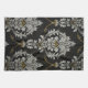 Un lujoso y ornamentado damasco con intrincados motivos florales blancos y dorados sobre un fondo negro. La decoración es clásica y refinada, con tapices de época, tejidos y decoración de gama alta.