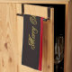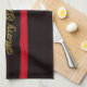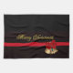 Hermosa toalla de cocina de Navidades con el dorado texto de Feliz Navidad con luces verdes sobre un fondo negro. Una falsa cinta roja con campanas doradas y un arco rojo atraviesa el diseño. Navidades muy elegantes para tus objetos de vacaciones.