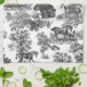 Patrón monocromo de tela en blanco y negro con caballos y árboles para la decoración rústica de campo, estilo inglés, francés o americano. El caballo es un animal majestuoso que encarna el poder espiritual de la independencia, libertad, nobleza, resistencia, confianza, triunfo, heroísmo y competencia. Su símbolo está asociado con fuerza, coraje y libertad.