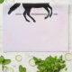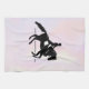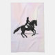 Una toalla de cocina con un ilustracion blanco y negro de un jinete. El caballo y el jinete están tocando una pirueta. Elegante y hermoso. Colocado en un fondo acuático de colores pastel delicados y mullidos.
