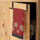 Toalla de cocina con elegantes copos de nieve brillantemente dorados purpurinas sobre fondo rojo, recortada en negro.