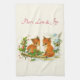 Toalla de cocina con un bonito dibujo de un par de zorros con un pájaro simpático cerca. Rodeado de cañas de pino y de hojaldre y de otros follajes de invierno. El texto (puedes cambiar) dice Paz, Amor y Alegría.