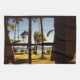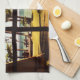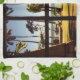 Escena tropical de la playa de Fiji Beach - Fotografía de una playa en las Islas Fiji con palmeras, hamacas y un banco de picnic visto a través de las persianas abiertas de una cabaña de playa. © Alan Harman Photography 2004. Reservados todos los derechos. www.alanharmanphotography.com toalla de cocina 120418