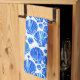 Toalla de cocina en forma de conchas marinas semiabstractas de color azul cobalto oscuro y azul claro sobre un fondo blanco